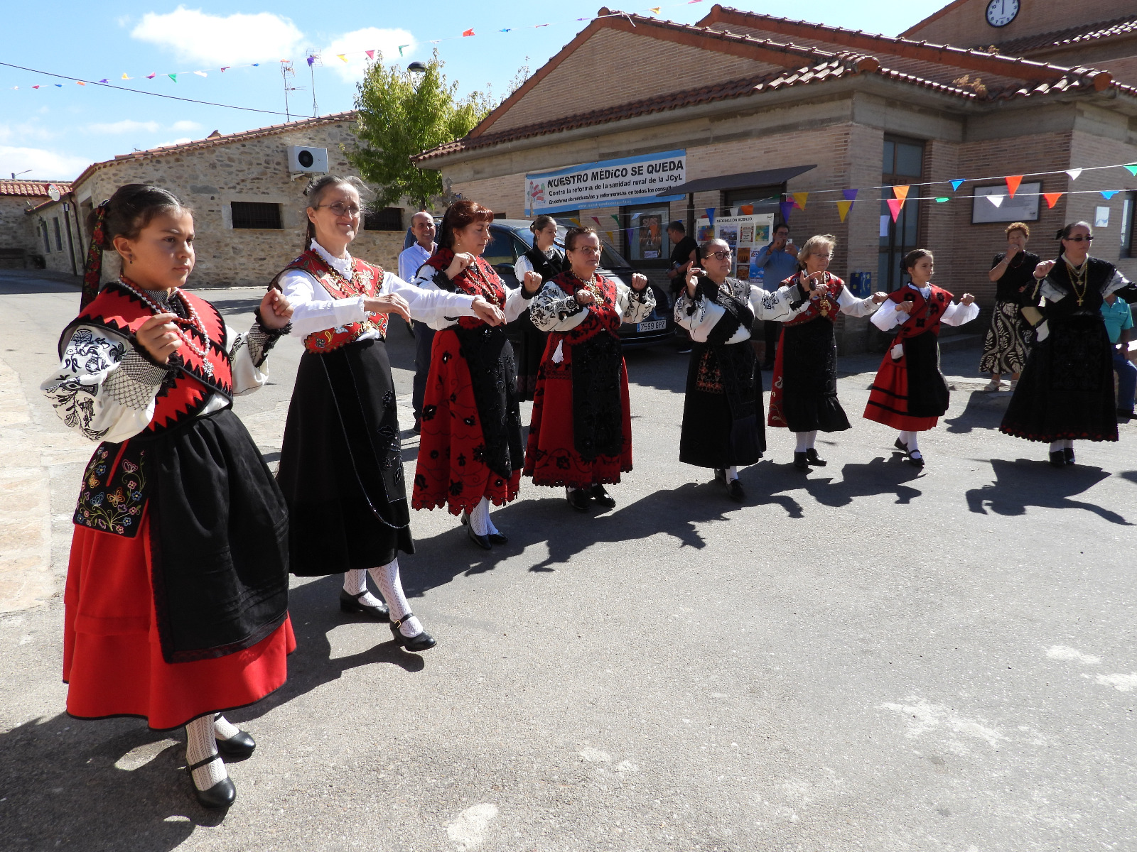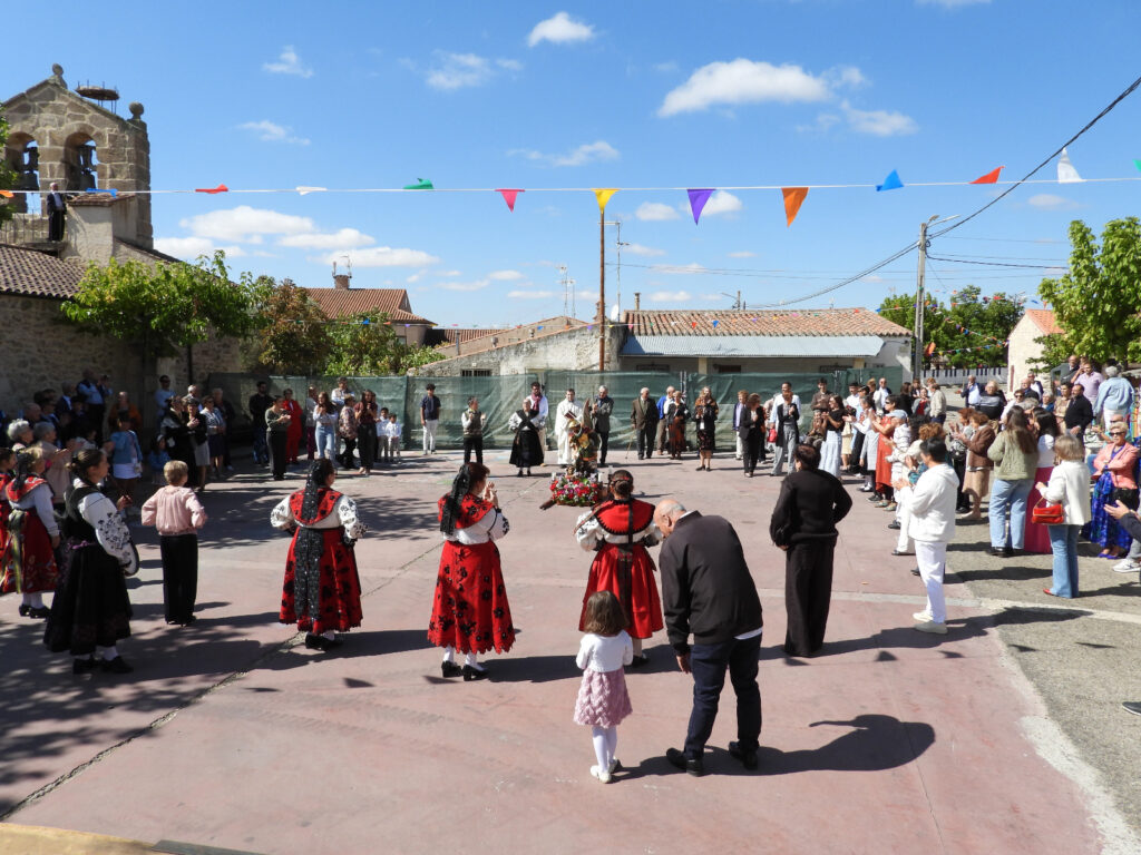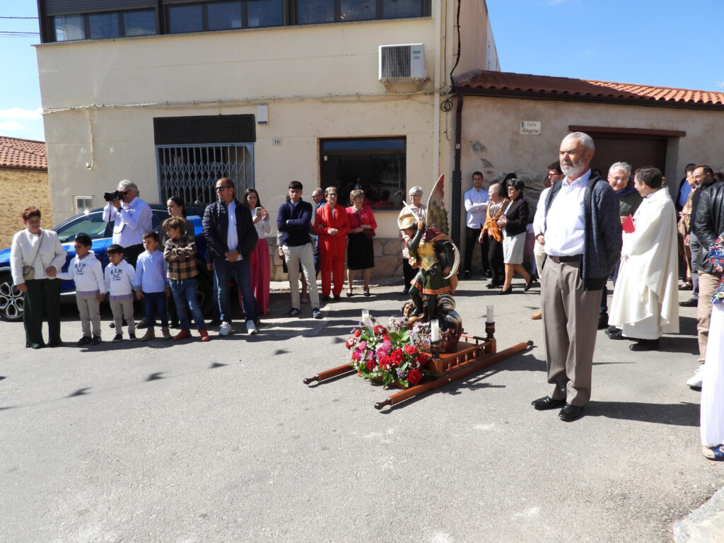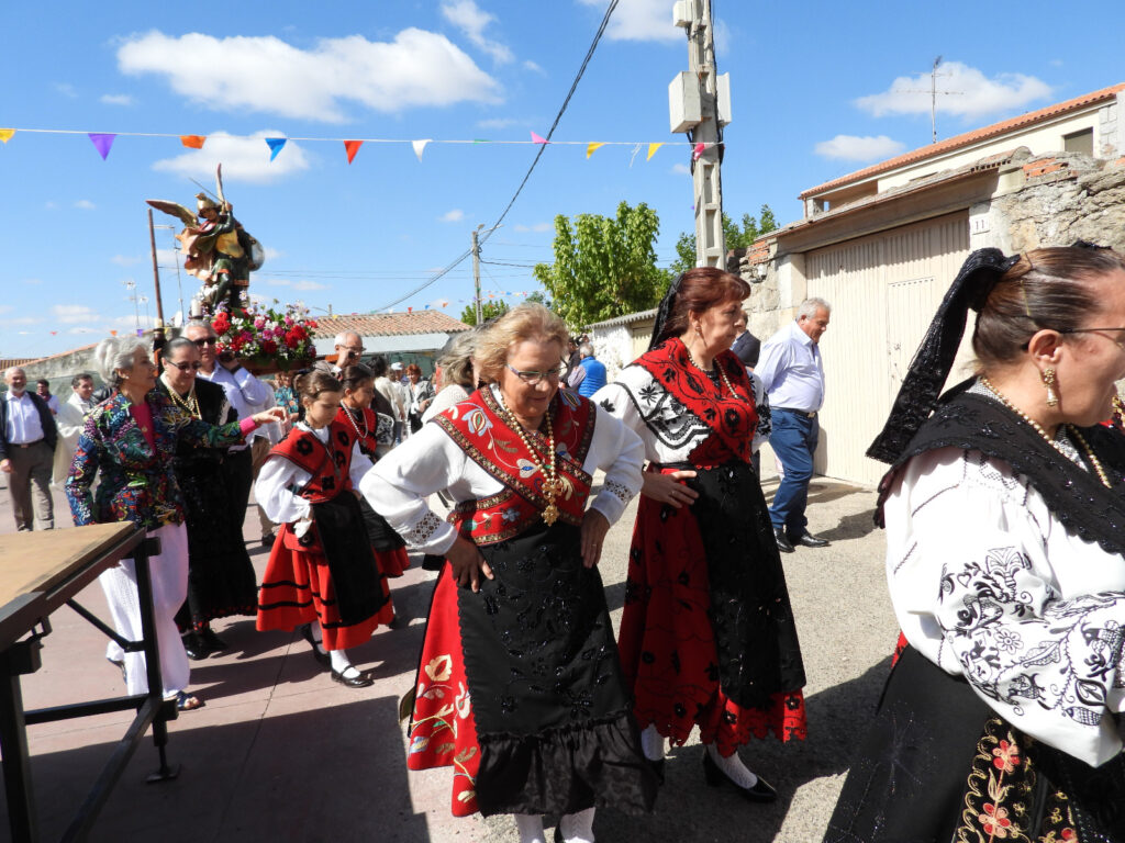 La mañana del lunes 28, último día de fiestas, se presentó con la tradicional procesión a San Miguel, en la que todo el mundo se engalana para acompañar y aupar la representación del Santo y un grupo de baile tradicional le baila y anima la travesía.
